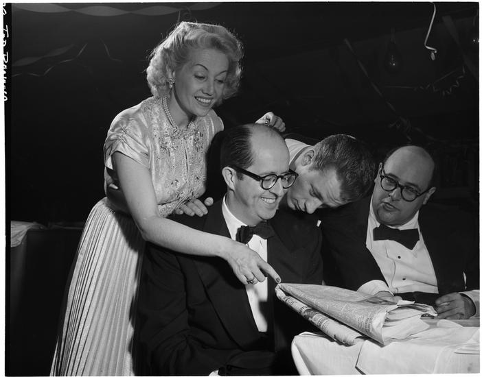 [Paula Stone, Phil Silvers and Mike Sloane at a party for "Top Banana".]