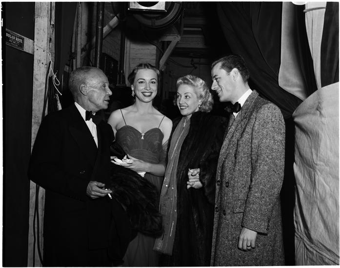 [Mike Sloane, Paula Stone, Phil Silvers, and General Douglas and Jean MacArthur backstage at "Top Banana".]
