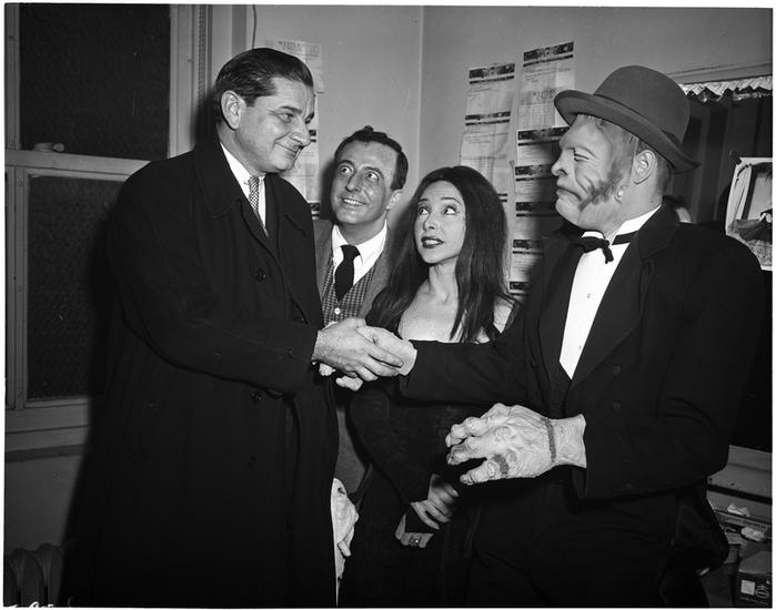[Eartha Kitt and Leonard Sillman with unidentified man backstage.]