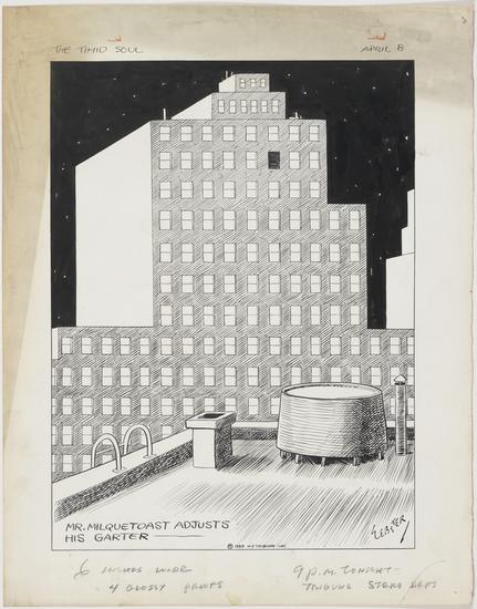Mr. Milquetoast is asked by a Californian and a New Yorker if he is going to the World's Fair.