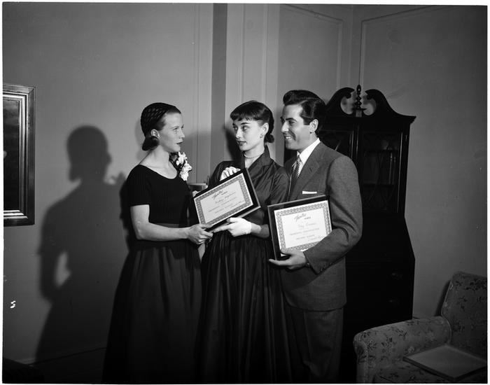 [Virginia de Luce, Ronny Graham and Julie Harris with the Theatre World Award.]