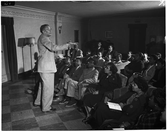 [Hall Johnson with choir on set of "The Green Pastures".]
