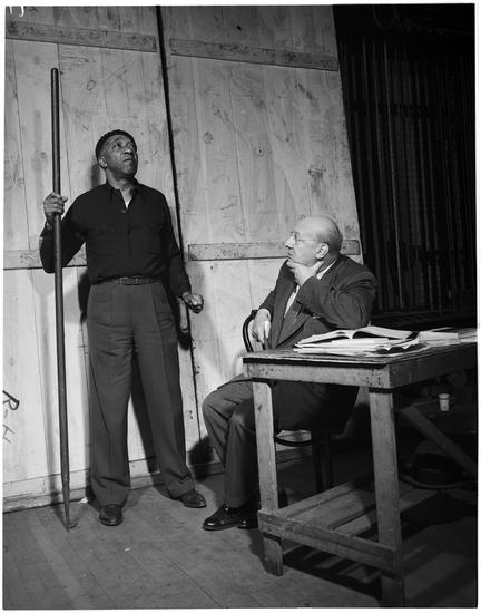 [Marc Connelly speaking to William Marshall another actor on the set of "The Green Pastures".]