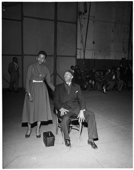 [Actor with Marc Connelly on the set of "The Green Pastures".]