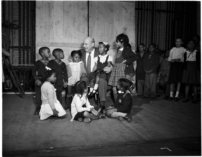 [Marc Connelly with children on the set of "The Green Pastures".]