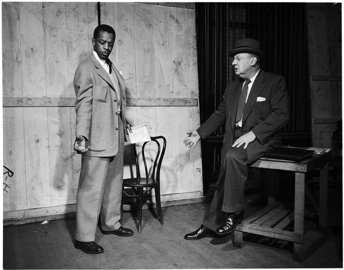 [Marc Connelly speaking to William Marshall another actor on the set of "The Green Pastures".]