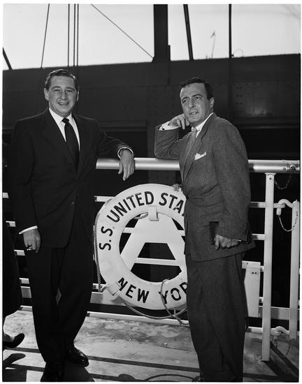 [Leonard Sillman shaking hands with a man on board the SS United States.]