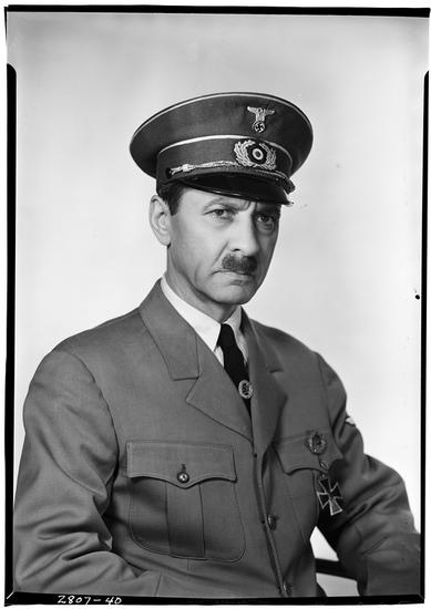 [Arthur Winton as General Von Bruck, Harry Green as Avrum Dovid and Brandon Peters as Adolf Hitler in "The Day Will Come".]