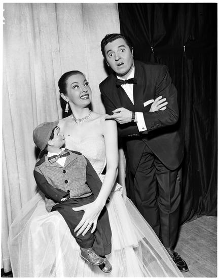 [Rickie Layne and his dummy, Velvel, and an unidentified actress in "Bagels and Yox".]