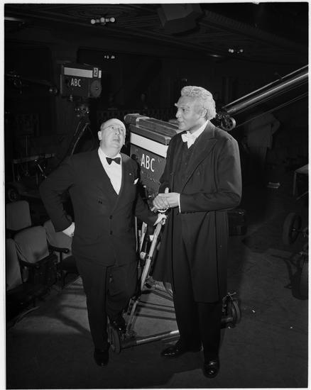 [Marc Connelly speaking to William Marshall another actor on the set of "The Green Pastures".]