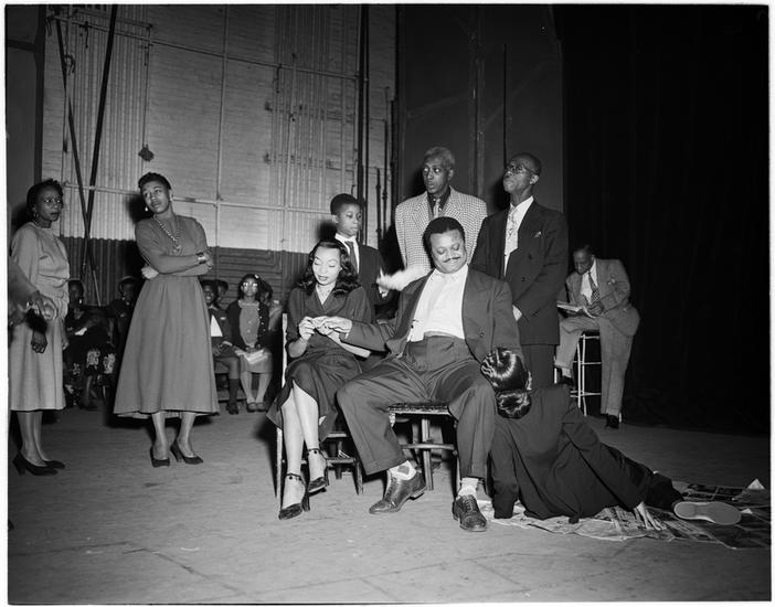 [Marc Connelly with actors on the set of "The Green Pastures".]