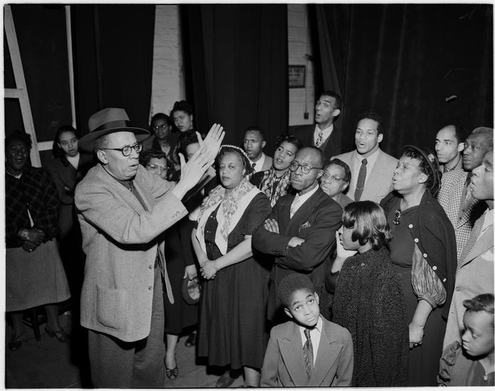 [Hall Johnson with choir on the set of "The Green Pastures".]