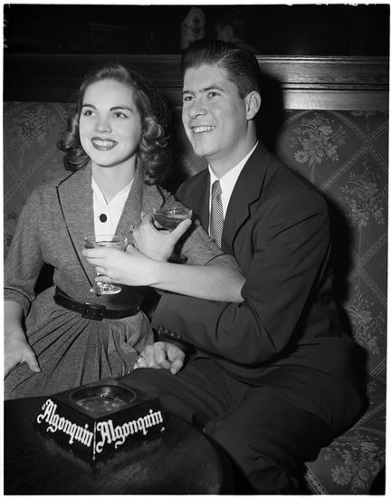 [Rosemary O'Reilly and a man celebrating in the Algonquin Hotel's cocktail lounge.]