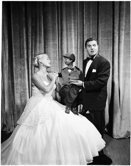 [Rickie Layne and his dummy, Velvel, and an unidentified actress in "Bagels and Yox".]