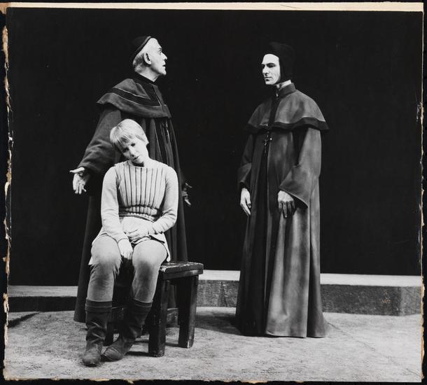 [Boris Karloff as Cauchon and Julie Harris as Joan in "The Lark".]