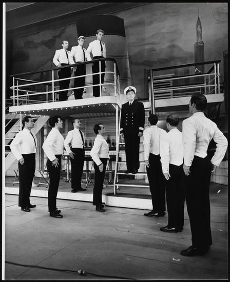 [Grover Dale as Barnaby Slade and Patricia Harty as Nancy Foyle in "Sail Away".]