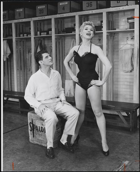 [Gretchen Wyler as Lola and Stephen Douglass as Joe Hardy in "Damn Yankees".]