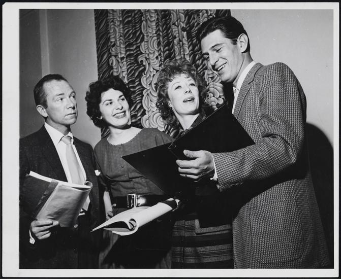 [Shannon Bolin, Ray Walston, Gwen Verdon and Stephen Douglass during a rehearsal for "Damn Yankees".]