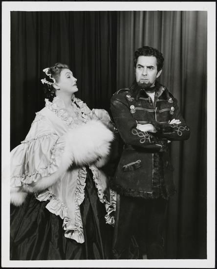 [Tyrone Power as Richard Gettner and Katharine Cornell as Countess Rosmarin Ostenburg in "The Dark is Light Enough".]