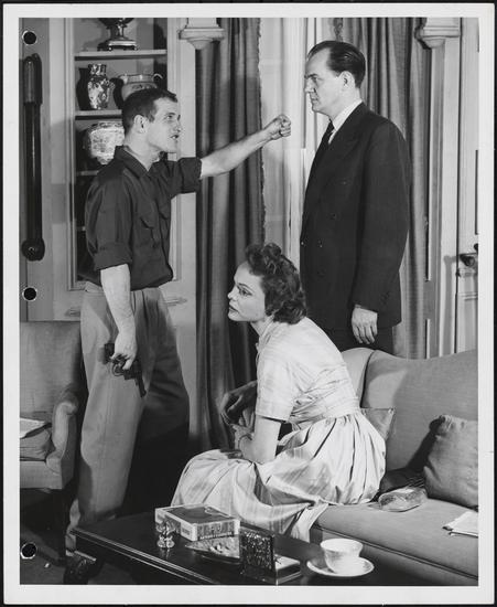 [Nancy Coleman as Eleanor Hillard, Malcolm Brodrick as Ralphie Hillard and Paul Newman as Glenn Griffin "The Desperate Hours".]