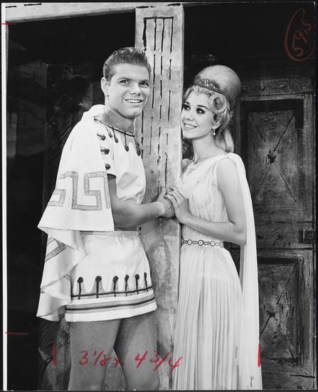[Gloria Kristy as Gymnasia and Zero Mostel as Prologus in "A Funny Thing Happened on the Way to the Forum".]