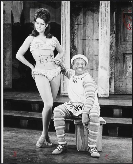[Gloria Kristy as Gymnasia and Zero Mostel as Prologus in "A Funny Thing Happened on the Way to the Forum".]