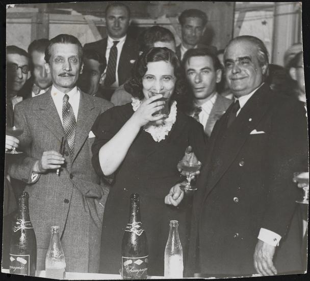 [Berta Gersten in a prizewinning dress constructed entirely from the Yiddish newspaper "Der Tog" for costume ball.]
