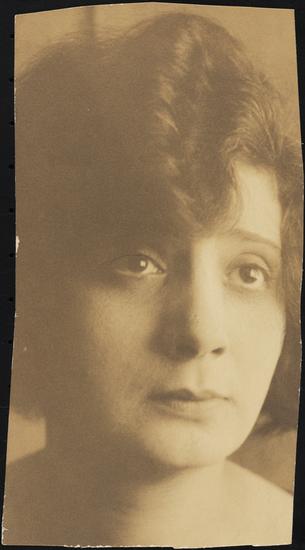 [Berta Gersten in a prizewinning dress constructed entirely from the Yiddish newspaper "Der Tog" for costume ball.]