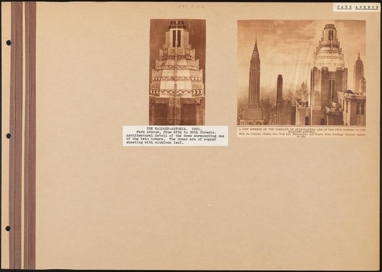 Description The Waldorf-Astoria. 1931. Park Avenue, from 49th to 50th Streets. Architectural detail of the dome surmounting one of the twin towers. The domes are of copper sheeting with aluminum leaf. | J. Clarence Davies Street Views Scrapbook