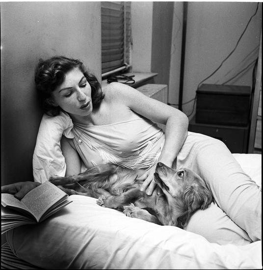 A Dog's Life in the Big City [Woman reading in bed with a dog.]