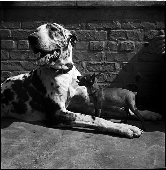 Description Magazine caption: "Great Dane and a miniature pinscher live happily together in city [...]"