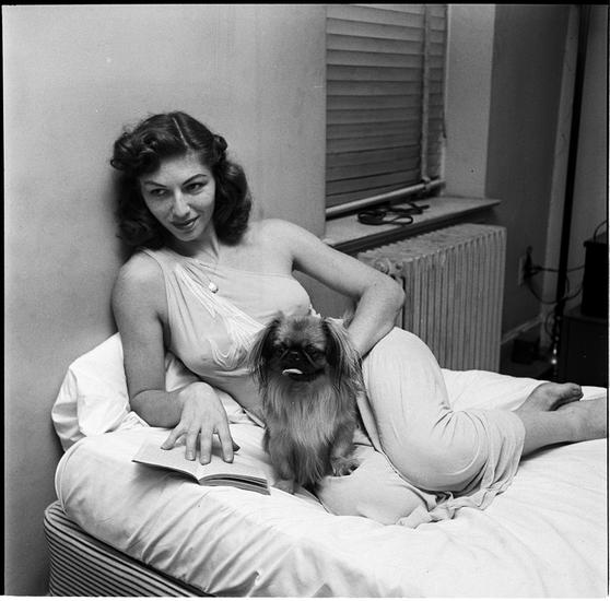 A Dog's Life in the Big City [Woman reading in bed with a dog.]