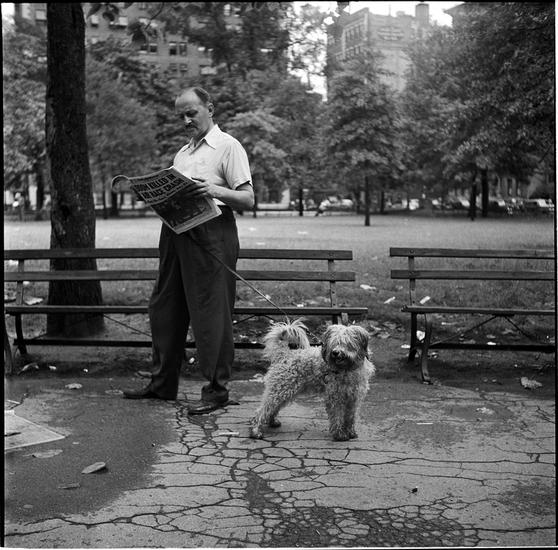 A Dog's Life in the Big City [Man reading newspaper while walking a dog.]