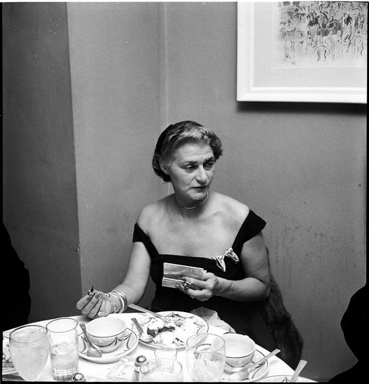 Gimbels Fashion Show [Group at table, woman checking her reflection in a compact.]