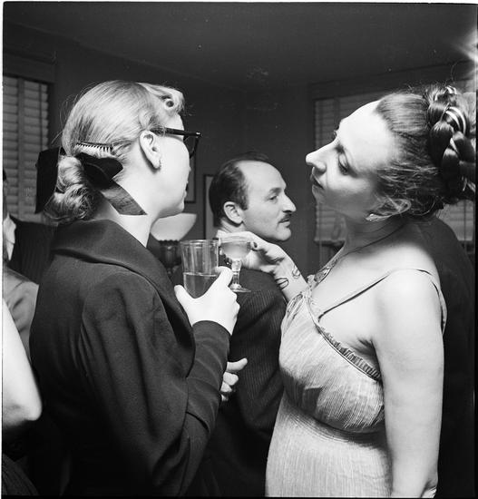 Leonard Bernstein [Women eating at a party as a man talks to her.]