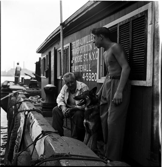 A Dog's Life in the Big City [Men with German Shepherd on a dock.]