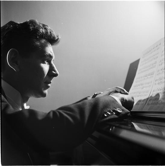 Leonard Bernstein [Leonard Bernstein at a piano looking at sheet music.]