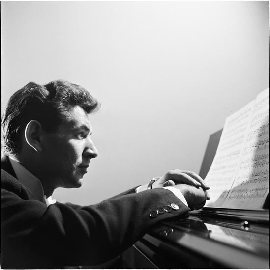 Leonard Bernstein [Leonard Bernstein at a piano looking at sheet music.]
