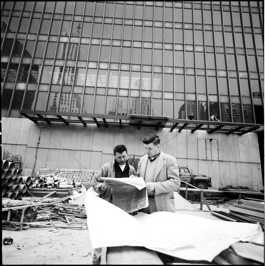 Park Avenue [Statue in apartment building courtyard and view of construction.]