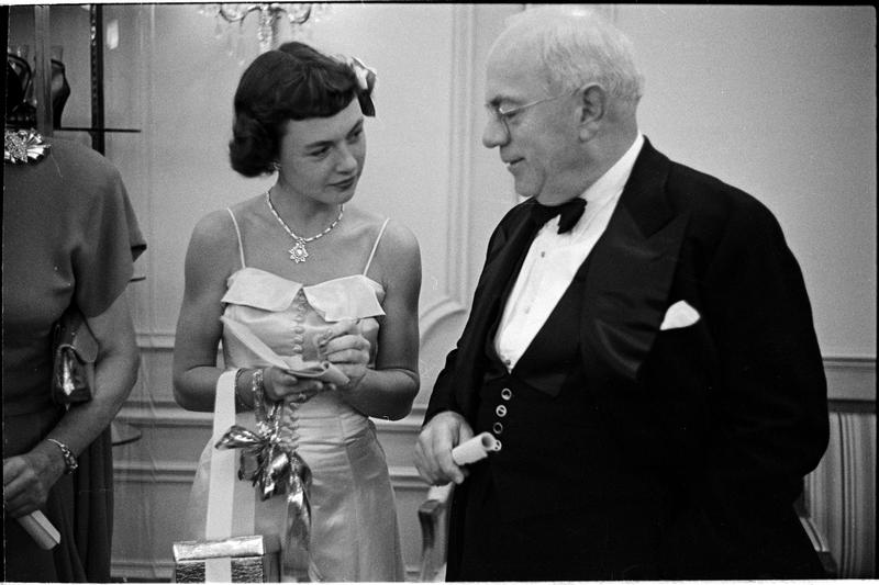 Gimbels Fashion Show [Man leaning down to talk to a seated woman.]