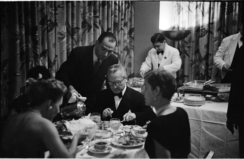 Gimbels Fashion Show [Couple at a table with a man standing and talking to them.]