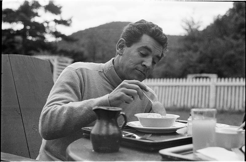 Leonard Bernstein [Leonard Bernstein eating outside.]