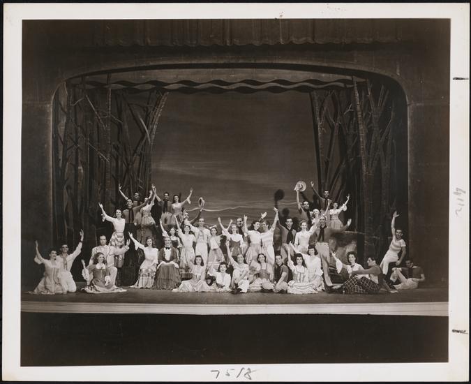 [Iva Withers as Julie Jordan with ensemble performing the "What's the Use of Wond'rin'?" number in "Carousel".]