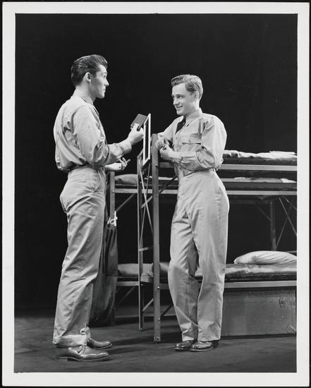 [Charles Mendick as Corporal Tate, David Pressman as Private Shevlin and Eddie O'Shea as Private Thomas Mulveroy in "The Eve of St. Mark".]