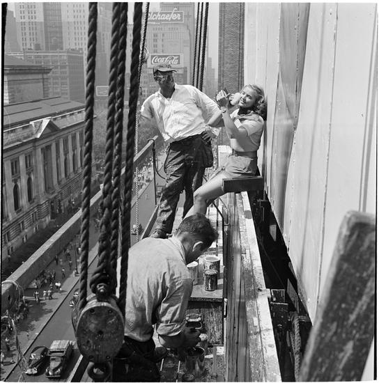 Advertising Outdoors [Painters helping model climb down scaffolding.]