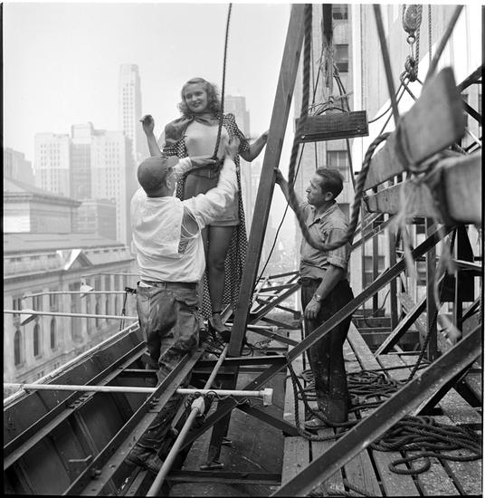 Advertising Outdoors [Painters helping model climb down scaffolding.]