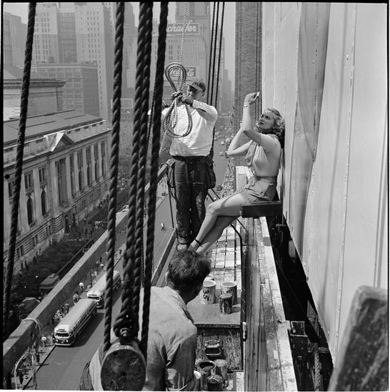 Advertising Outdoors [Painters helping model climb down scaffolding.]