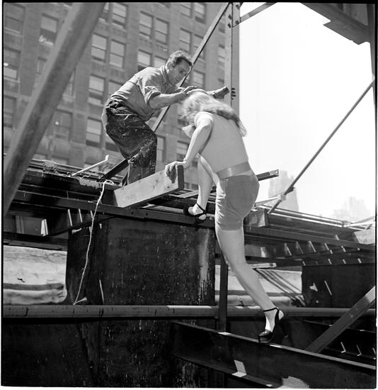 Advertising Outdoors [A painter helps the model navigate the scaffolding.]