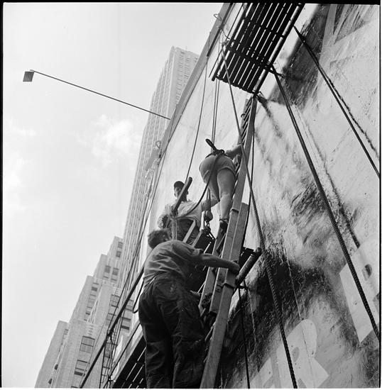 Advertising Outdoors [Painters helping model climb down scaffolding.]
