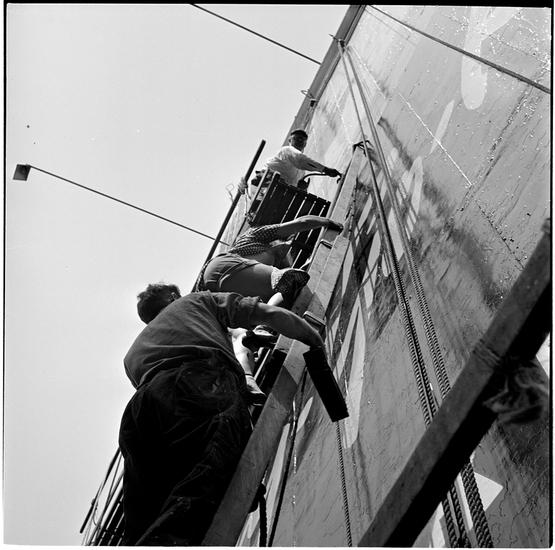 Advertising Outdoors [Painters helping model get on the ladder.]